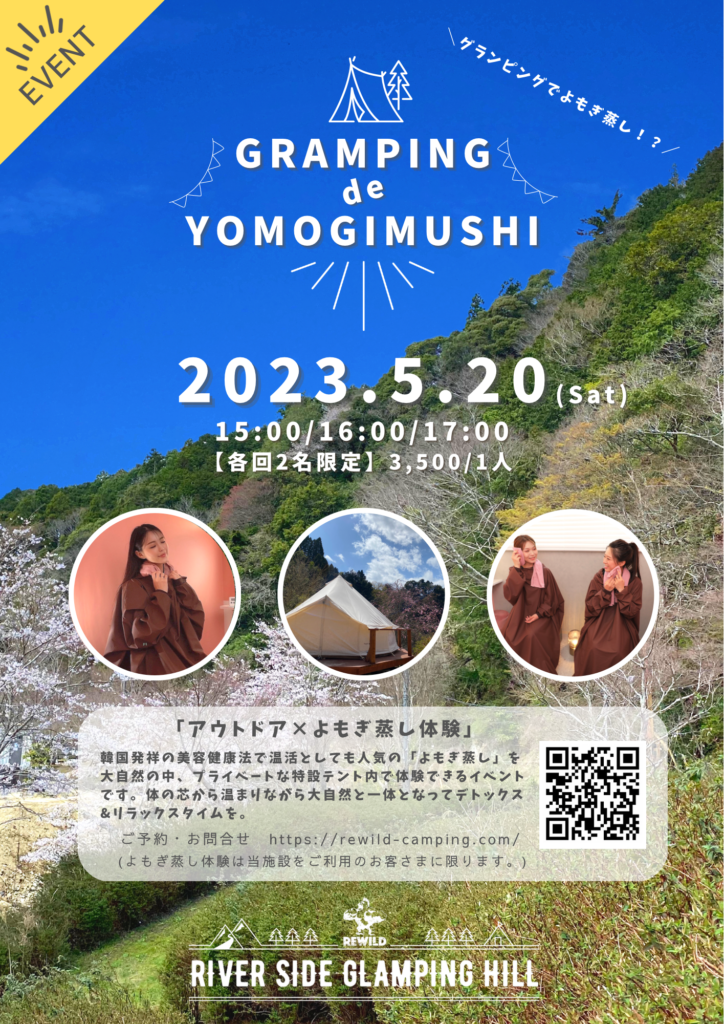 2023年5月20日(土)よもぎ蒸し体験 韓国発祥の美容健康法で温活としても人気の「よもぎ蒸し」を大自然の中、プライベートな特設テント内体験できます。 よもぎ蒸しで体の中から綺麗になり!そのあとは温泉でゆっくりまった […]